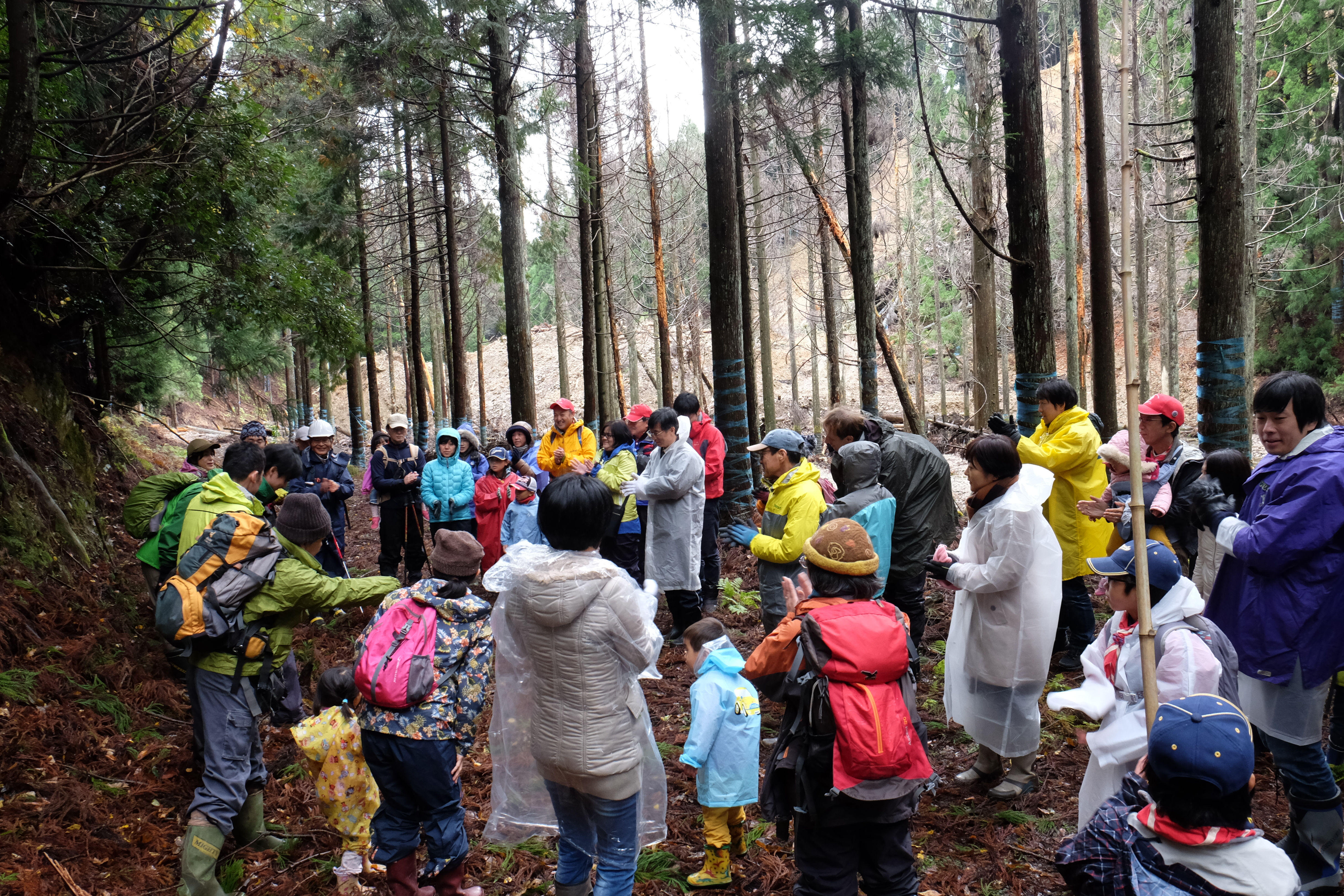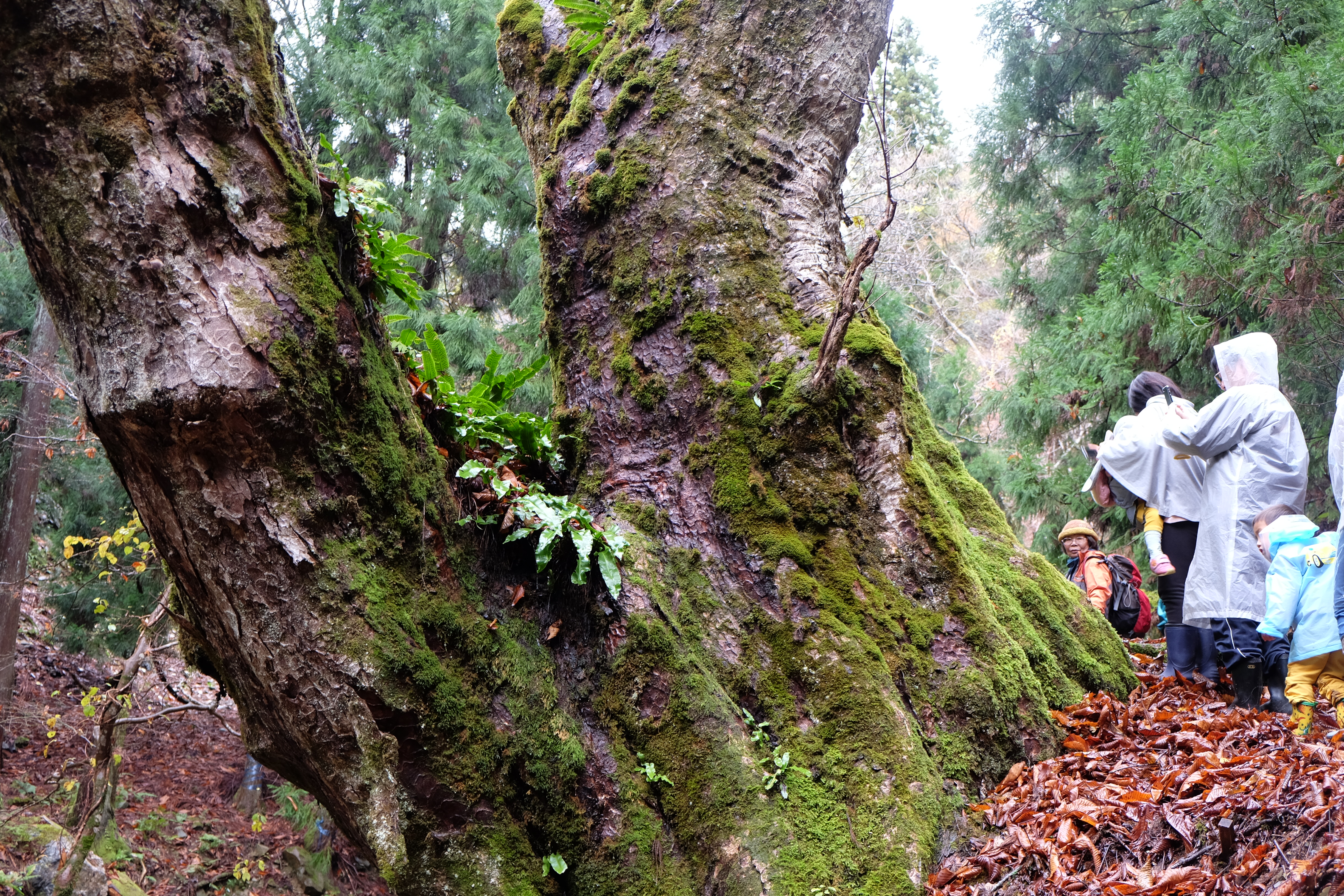 マイクロバスから皆さんの車に乗り換えた後、さらに徒歩で林道をご案内頂いて、世代を超えた全ての参加者が、奥山にそびえる幹周り8メートル超の巨木にあうことができました。